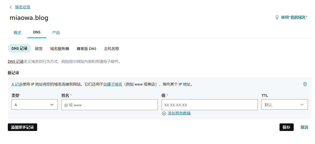 二级域名:二级域名通常是由一级域名延伸出来的,比如我的博客blog.miaowa.blog或者www.miaowa.blog或者abc.miaow.blog,理论来说,自己购买一级域名之后,可以创建无限个二级域名。