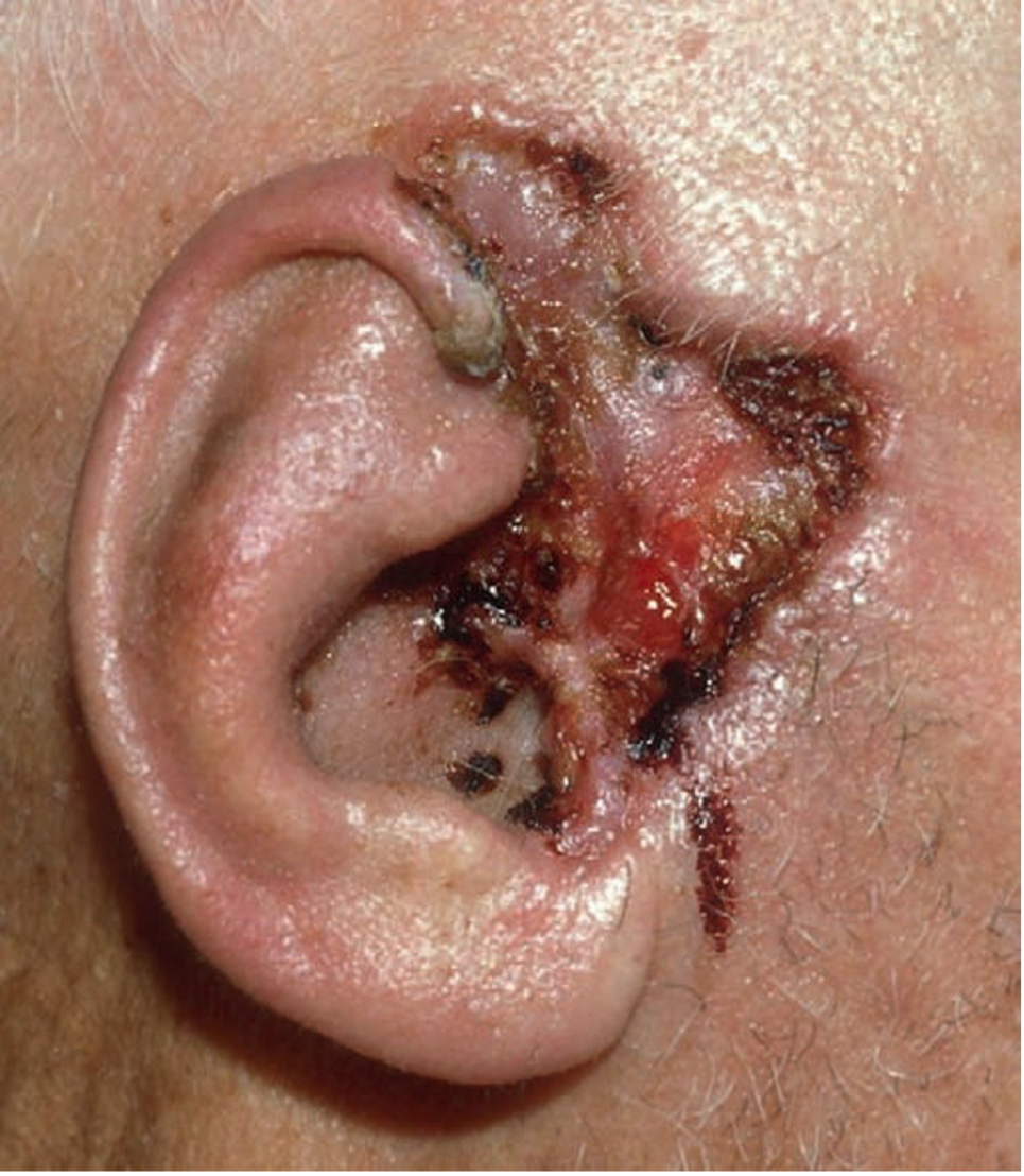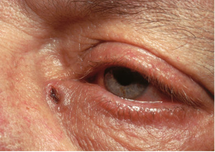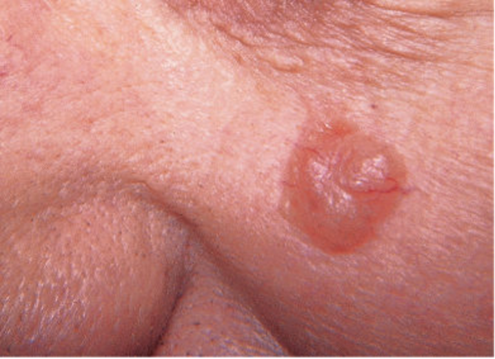 基底细胞癌大多数皮损见于日光暴露区(例如面部、头部、颈部和手臂),典型皮损表现为中央溃疡的结节或斑块,边缘隆起呈珍珠状,颜色从肤色、粉色、褐色至黑色不等。生长缓慢,往往局限于皮肤而很少发生转移。当然,某些特殊类型的基底细胞癌也具侵袭性,可以造成广泛的局部破坏甚至转移。