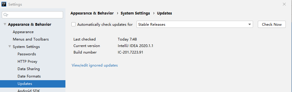 1 停止IDEA更新,具体做法是,菜单File,Setting,找到Updates,勾掉更新选项,如下图所示。