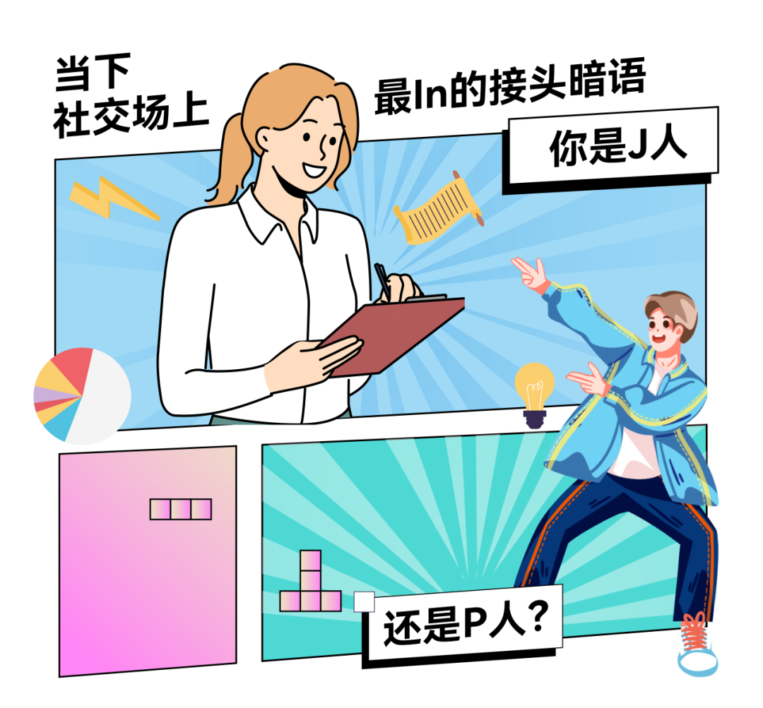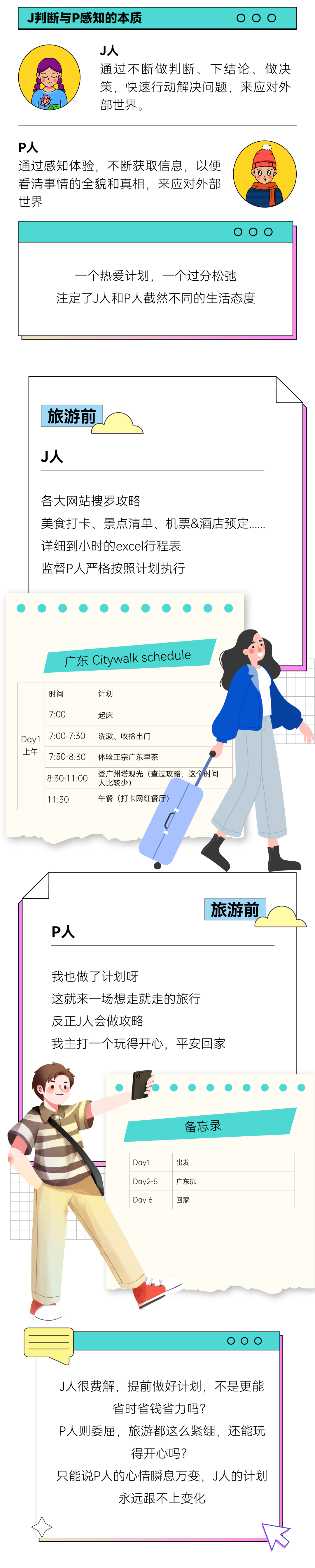 出自MBTI人格分类中的第四维度,J代表着判断,P代表着感知。简单来说,J人喜欢条理清晰的计划,P人则倾向于灵活和随心而动。