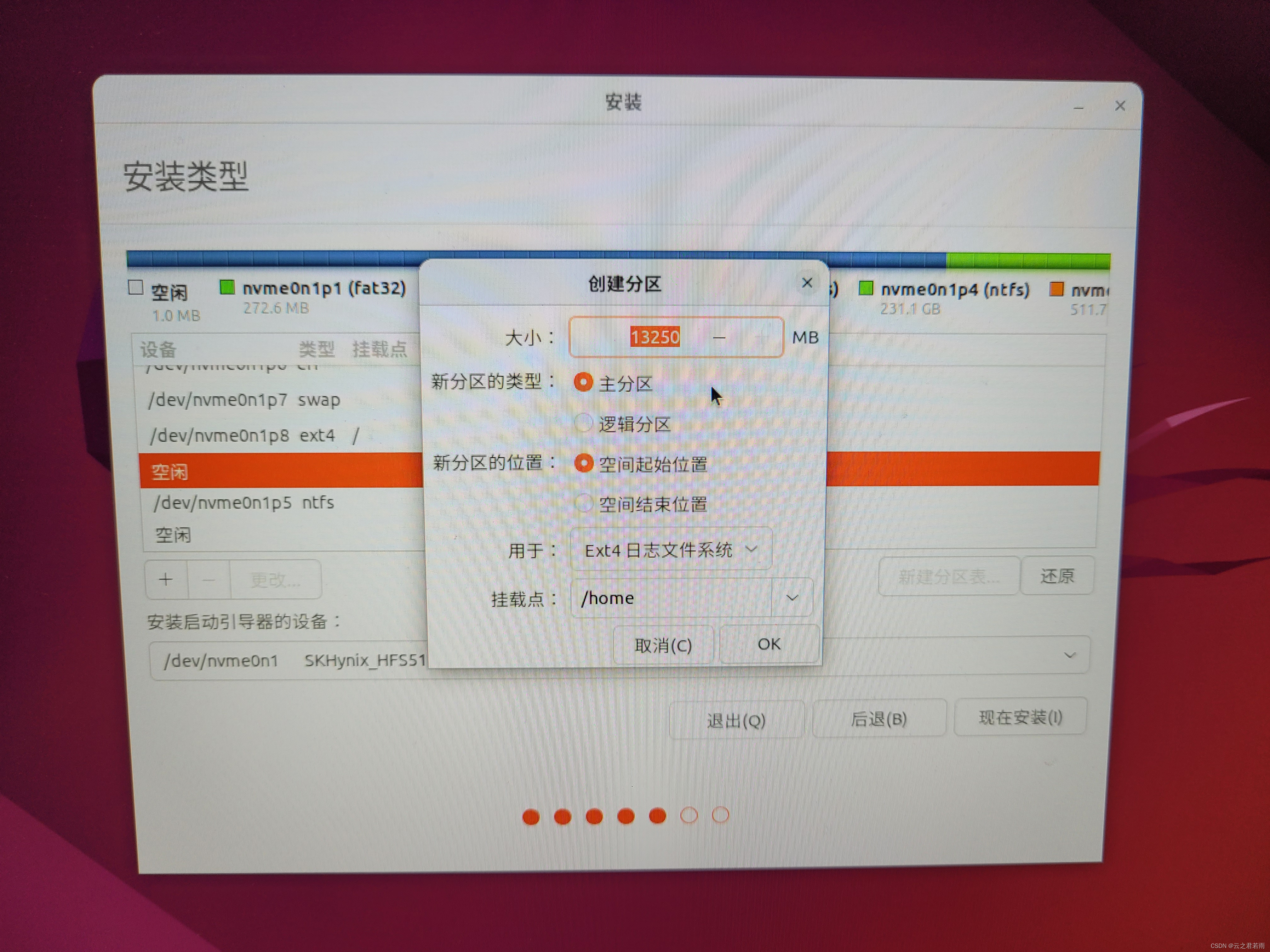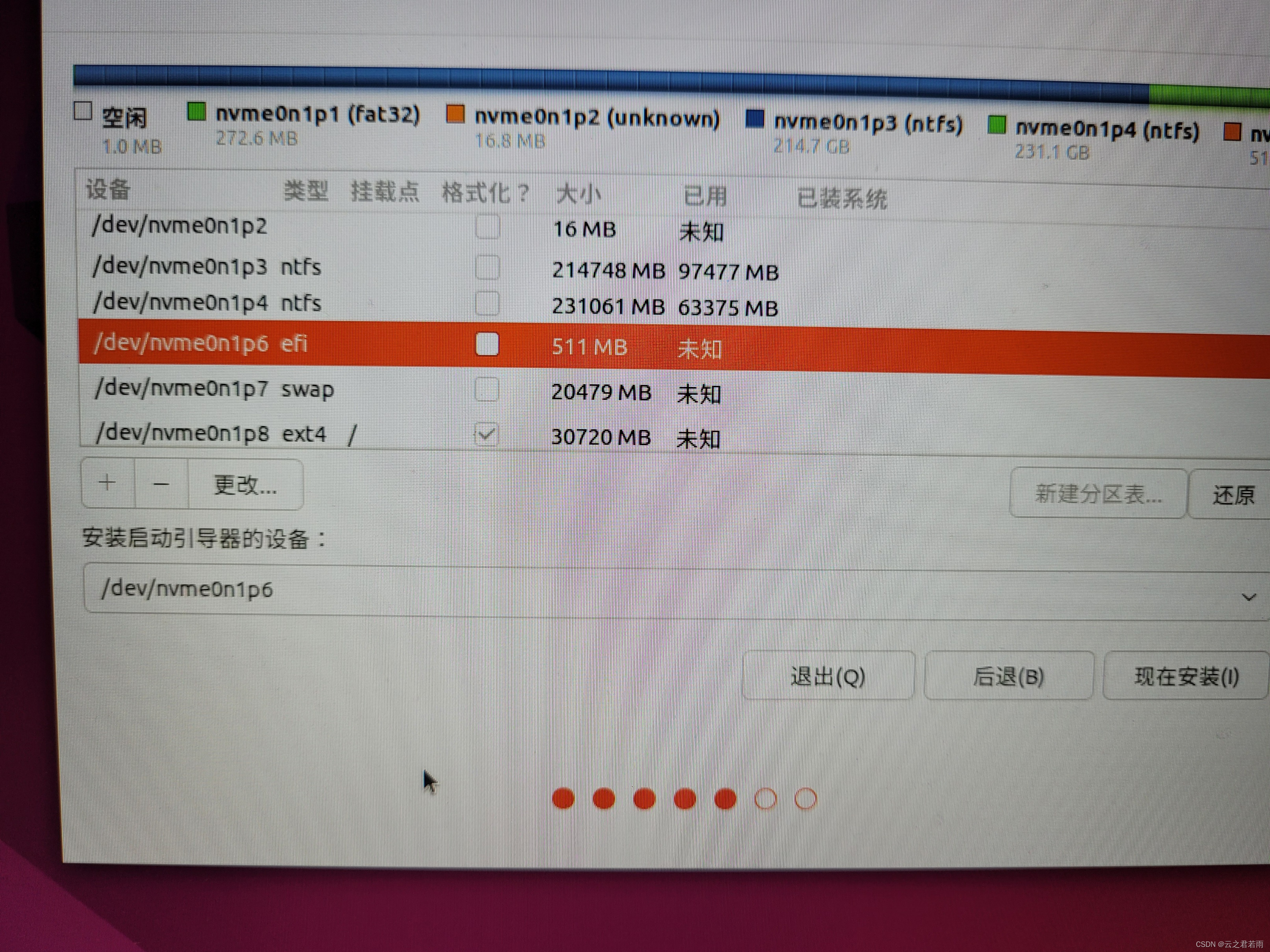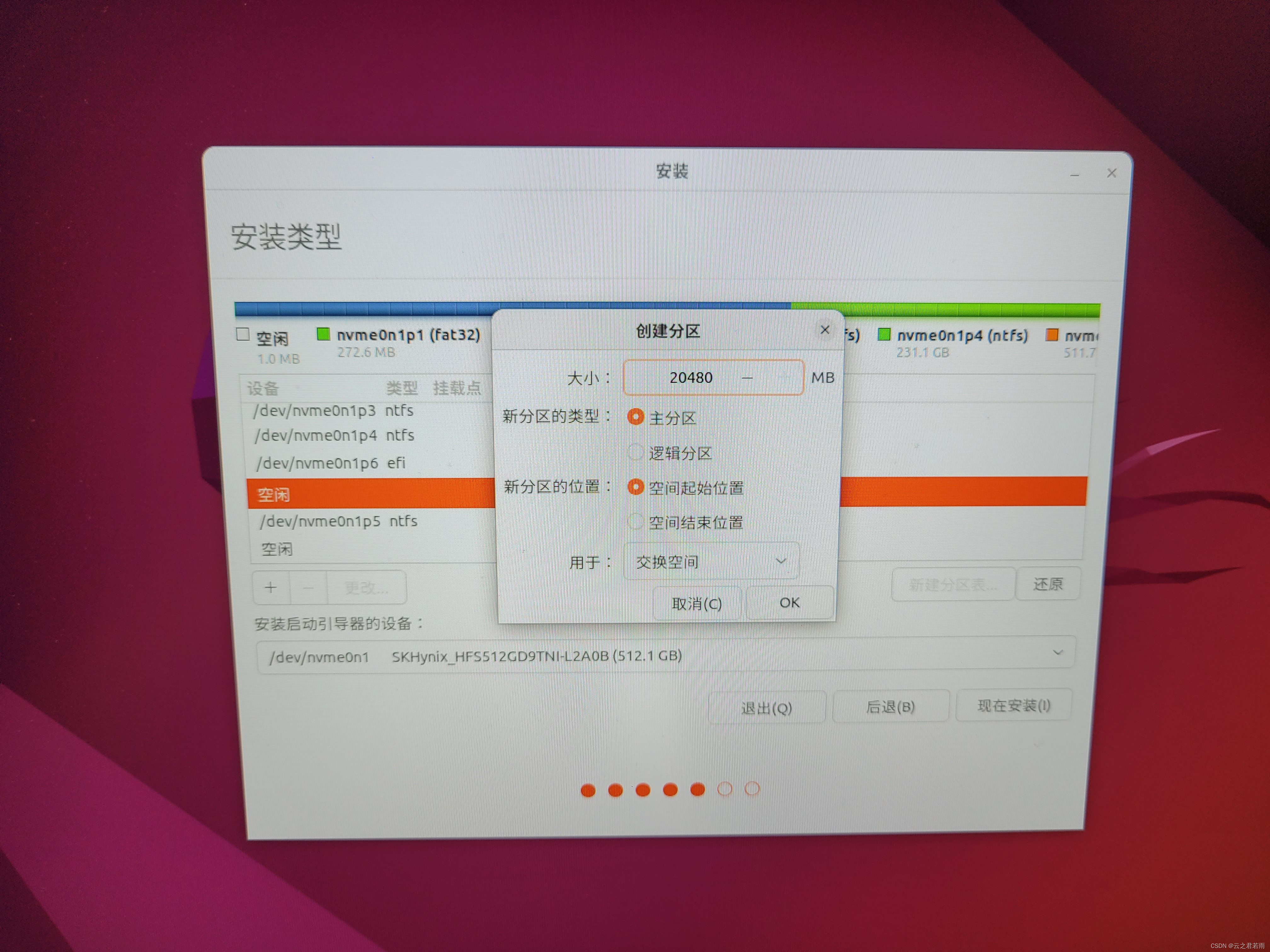 将下方安装启动引导器的设备改为:nvme0n1p6;