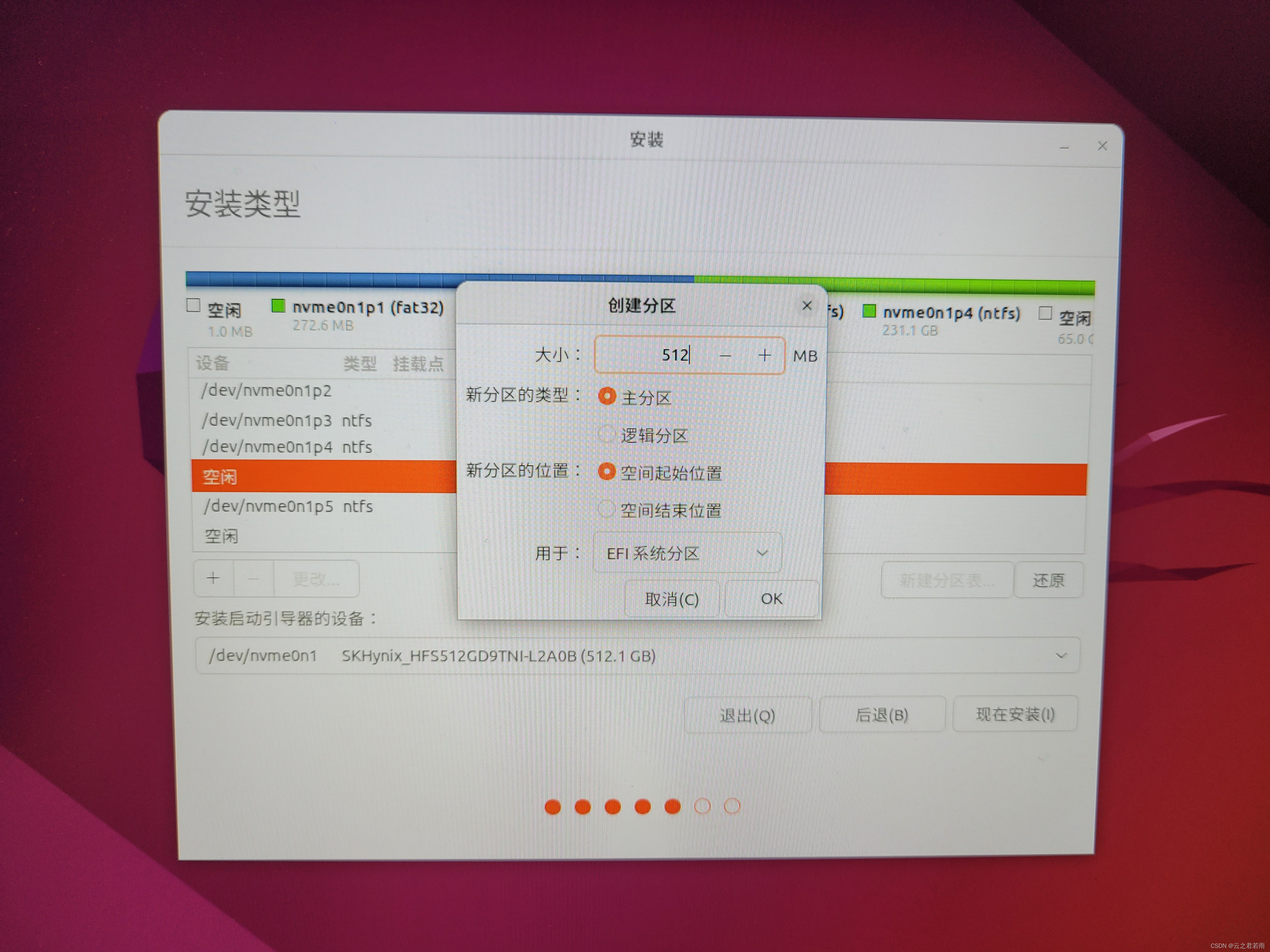 选择空闲区域,先创建512MB大小的EFI系统分区,作为Ubuntu系统的引导项