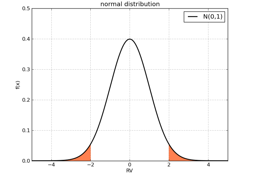 这个概率依赖于分布本身的类型。比如正态分布N(0,1)N(0,1),这一概率即为x大于2,或者x小于-2的部分对应的曲线下面积: