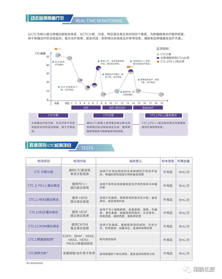 本检测以肿瘤患者外周血(循环肿瘤细胞CTC)为样本,通过CTC计数和分型,以及CTC上PD-L1检测,为肿瘤诊断、实时监测、预后、用药指导等提供更准确全面的判断依据,尤其是为无法获得肿瘤组织样本的肿瘤患者提供可能的免疫治疗机会。