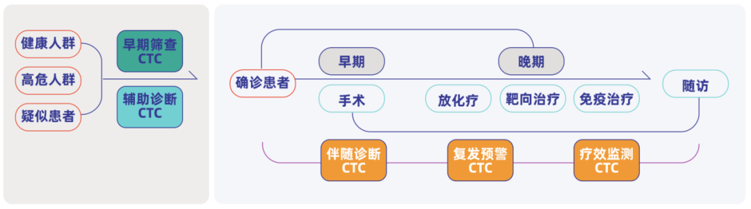 CTC检测可以有效应用于肿瘤早期诊断,疗效的快速评估,个体化治疗包括药物标靶、耐药性的检测,肿瘤复发风险评估,病情监测等。