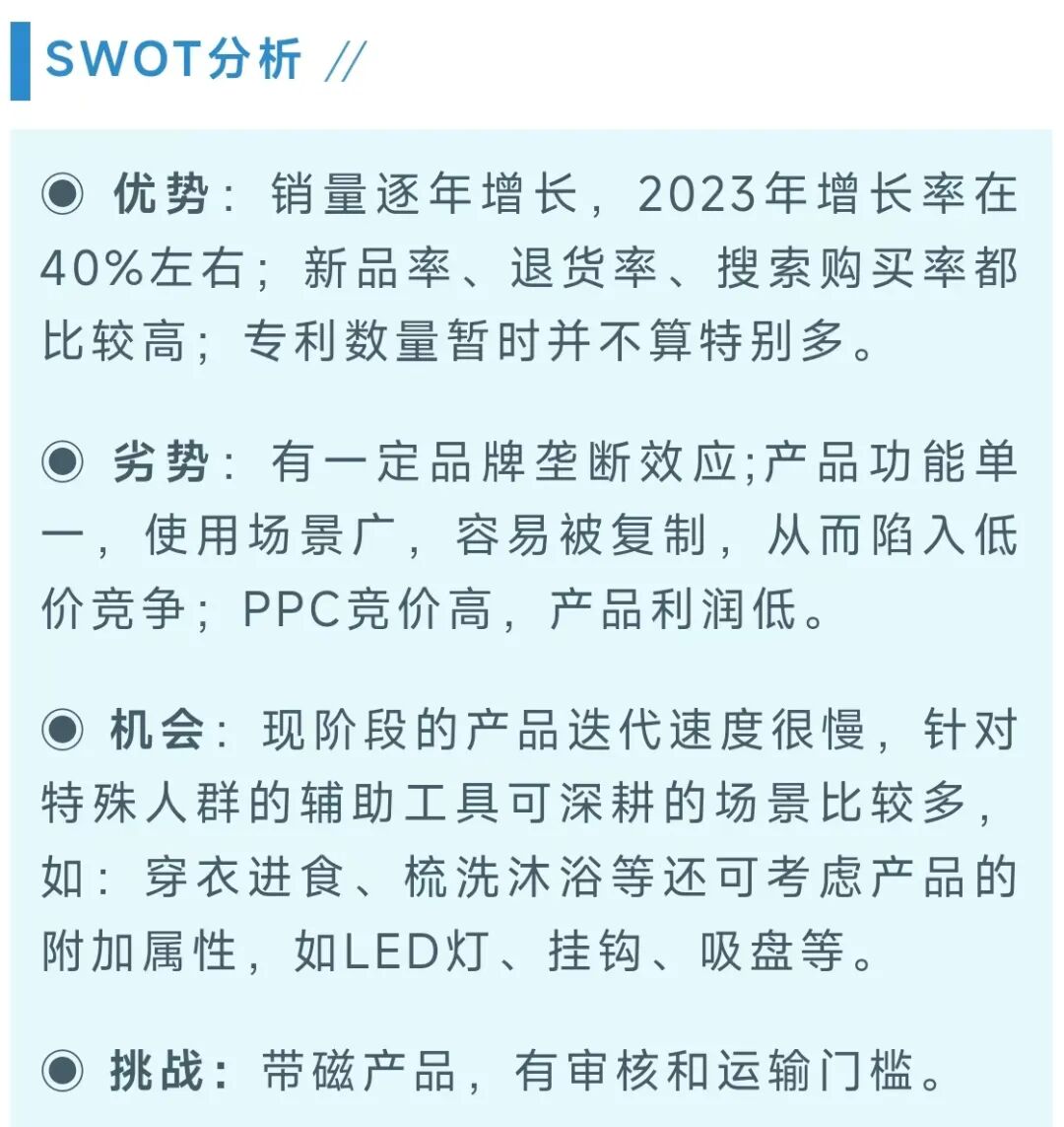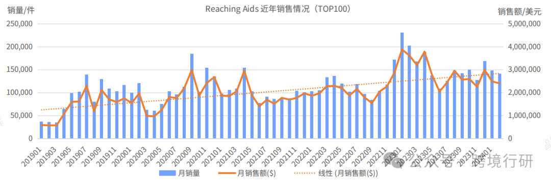 Reaching Aids是一个比较小众的市场,头部品牌销量尚可,但尾部品牌占比偏小