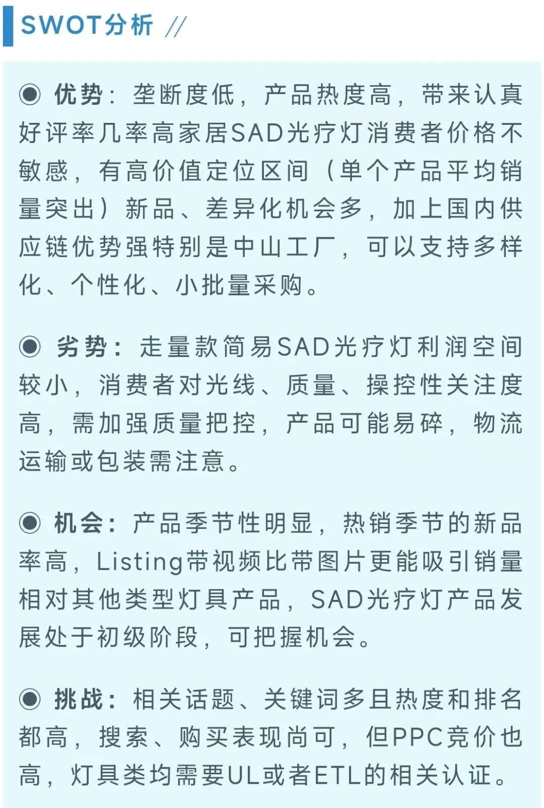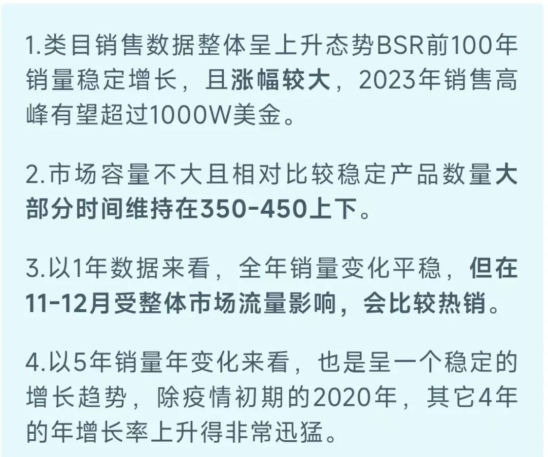 Light Therapy市场需求稳定,2023年销量接近156万,销量同比增加43.6%,年销售额超过1亿美元。其中的SAD光疗灯,热度和话题度在持续走高,处于高速发展期,未来发展空间值得关注。卖家需结合自身实际决定是否适合进入。