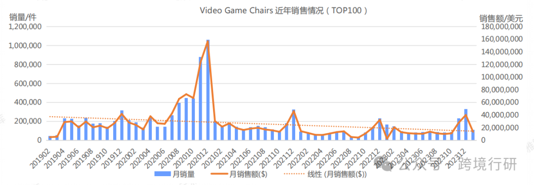 Video Game Chais 市场需求稳定,2023年年销售额约为1.8亿美元,年销量约155万套,销量同比上升50.45%,新品率高,每月销量都不错,年底有小高峰。