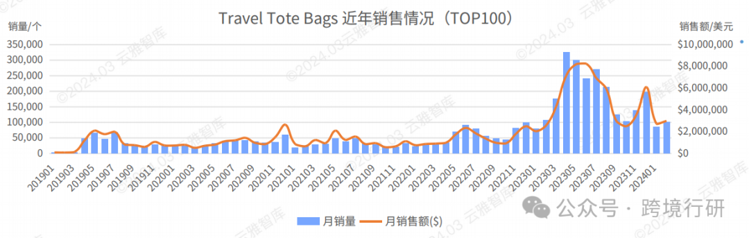 Travel Tote Bags是一个比较小众的市场,2023年旅行手提包年销量约228万件,销量同比上升217.88%,年销售额接近6058万美元。