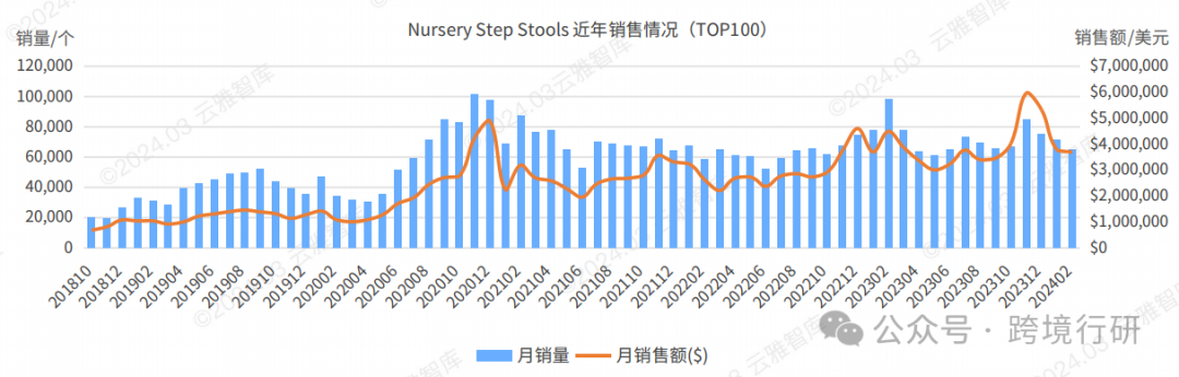 Nursery Step Stools是一个规模不大的市场,但也算婴幼儿家庭主流需求。2023年幼儿台阶凳年销量约103万件销量同比上升18.7%,年销售额超过5,550万美元。
