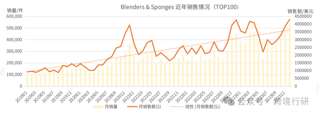 2023年美妆海绵年销售额接近4090万美元,年销量约483万件,销量同比上升约42.34%。