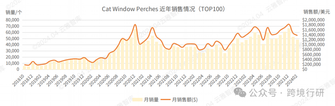 Cat Window Perches是一个规模不大的市场,非刚需类产品。2023年猫吊床年销量约72万件,销量同比上升60.7%,年销售额超过2,237万美元,上升趋势明显。