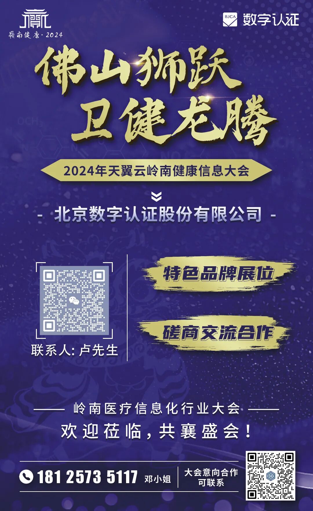 北京数字认证股份有限公司将亮相“佛山狮跃,卫健龙腾”2024年天翼云岭南健康信息大会,进行医疗信息化相关的特色展示,共同推动佛山医疗信息化高质量发展。