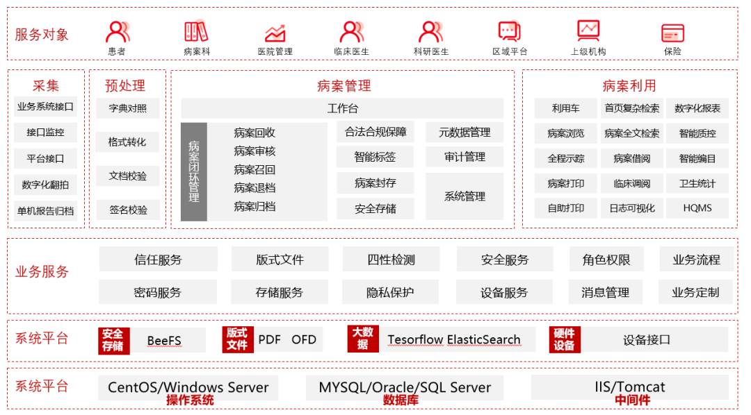公司采用先进的领域模型架构、微服务的模式并全面考虑了电子病案无纸化后版式文件合法合规处理,利用专有的自动检测对比技术,在灵活配置、易用高效的满足病案管理需求的基础上,把合法合规、质量保障融会到病案全流程管理当中,致力于打造安全可靠,易用高质量的电子病案。