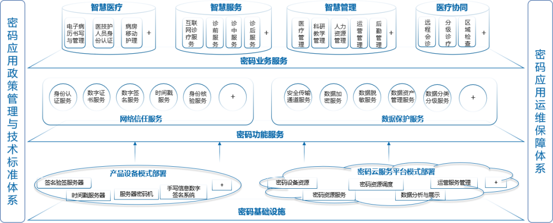 公司面向医院的数据、网络安全需求,依托政策法规与标准规范,遵循“同步规划、同步建设、同步运行”的建设原则,有效整合各类密码资源和密码业务,提供统一的、标准的密码服务,覆盖从密码算法、密码技术、密码服务、密码协议到医院密码应用流程的各个环节,建设整体的密码保障体系,为医院业务应用系统提供全面、安全、灵活、可控的密码服务,同时满足商用密码应用安全评估要求。