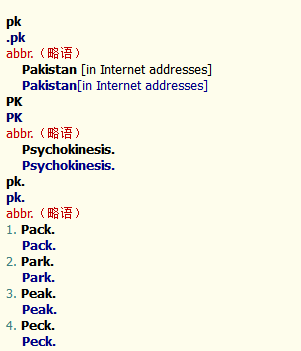 park(公园)、peak(峰值)、Pakistan(巴基斯坦)等的缩写