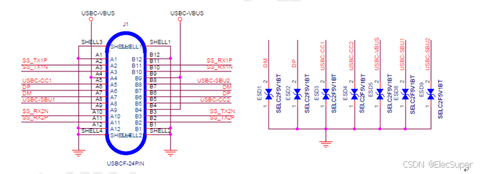 在Type C接口的DM/DP差分线、电源线VBUS、通信通道CC1/CC2和辅助通道SBU1/SBU2的静电保护上,考虑线速和电压,我们推荐采用的SELC2F5V1BT,可对单路高速数据线进行静电防护。其结电容为0.25pF,工作电压为5V,钳位电压为仅为22V,小体积DFN1006-2L方便布线,符合IEC 61000-4-2 (ESD) 规范,在 ±25(空气)和 ±22kV(接触)下提供瞬变保护。