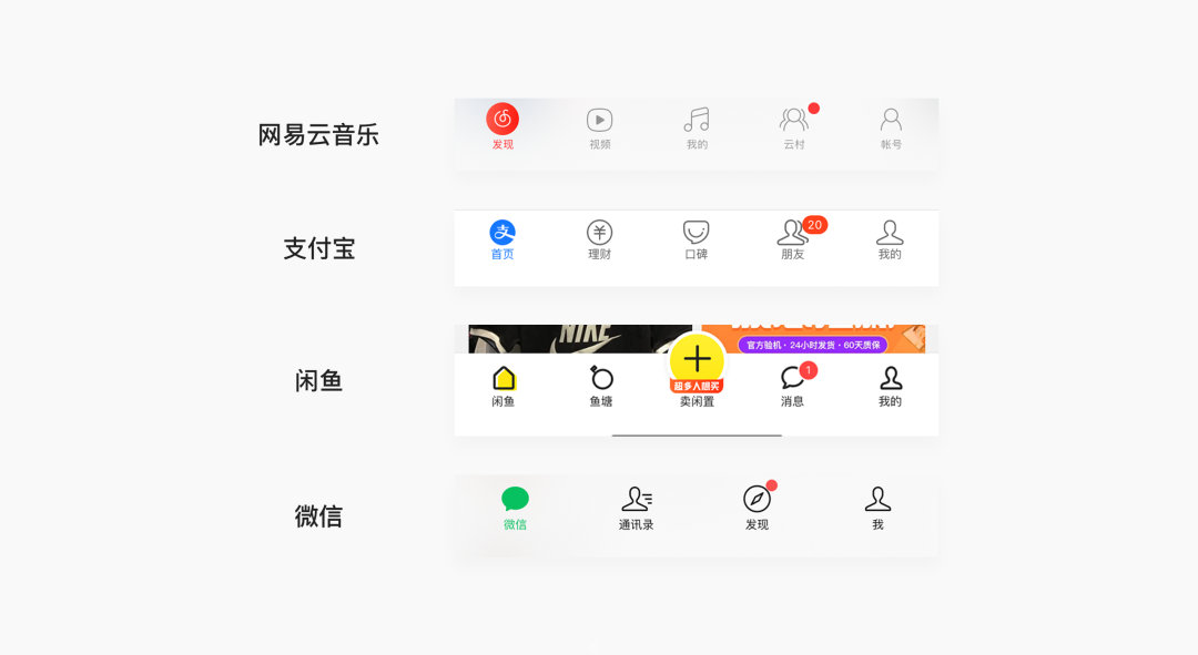 位于主页页面底部,利于用户页面切换,图标数量一般控制在3~5个为宜,采用图标结合文字的方式体现产品功能。