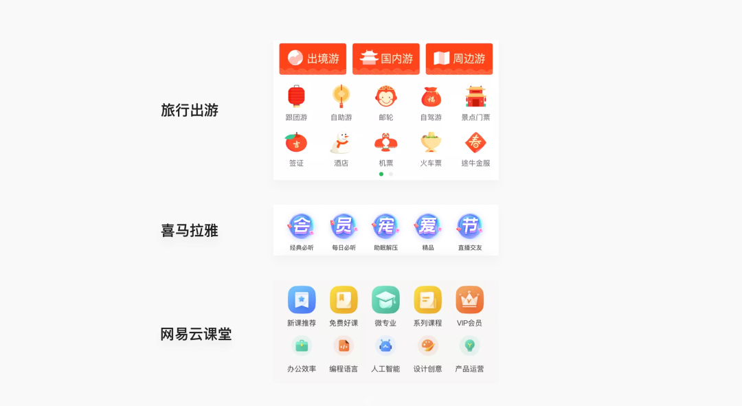 常见的比如:表现行业特性时,金刚区或个别功能区icon设计;面向不同用户群体时,选择风格设计,早教类APP与健康类APP对比就很明显。