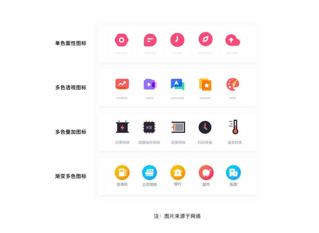 面性图标的分类也有很多,不仅仅只有常规的,还有多色,渐变,不透明叠加,插画,扁平投影等等。