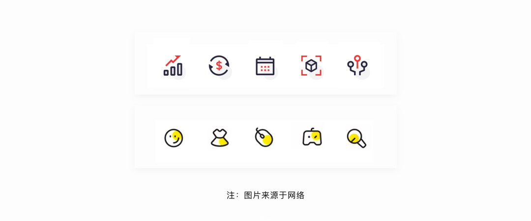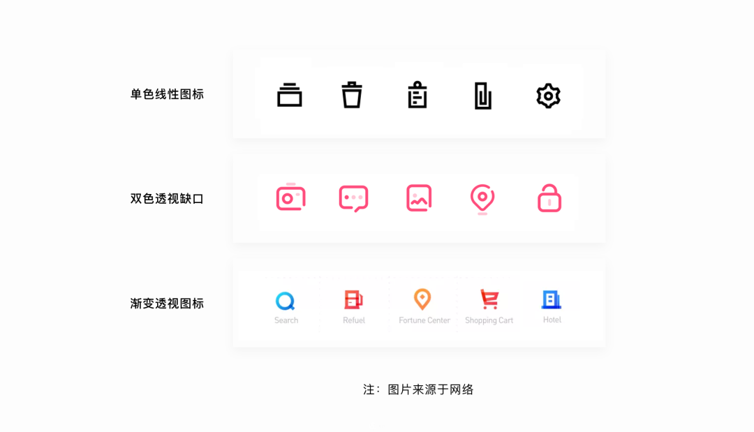 其实就是线+面,面+面。变现方式多样,拓展性强,更个性化,年轻化一些,相同,同样设计风格的icon,在更换颜色后就能体现和传达不一样的信息。
