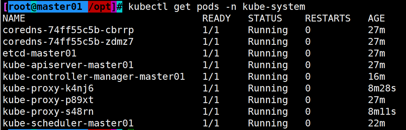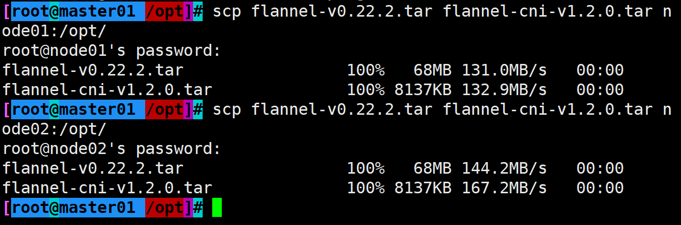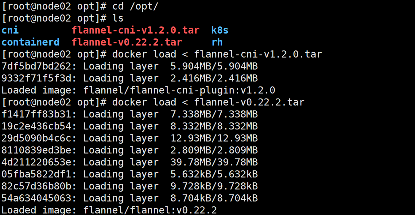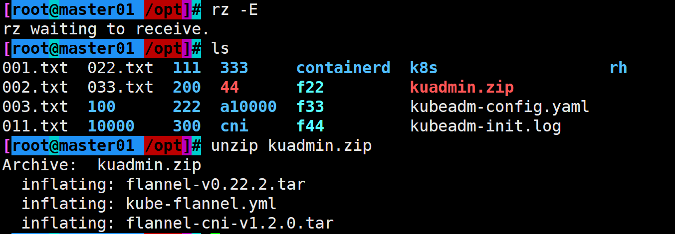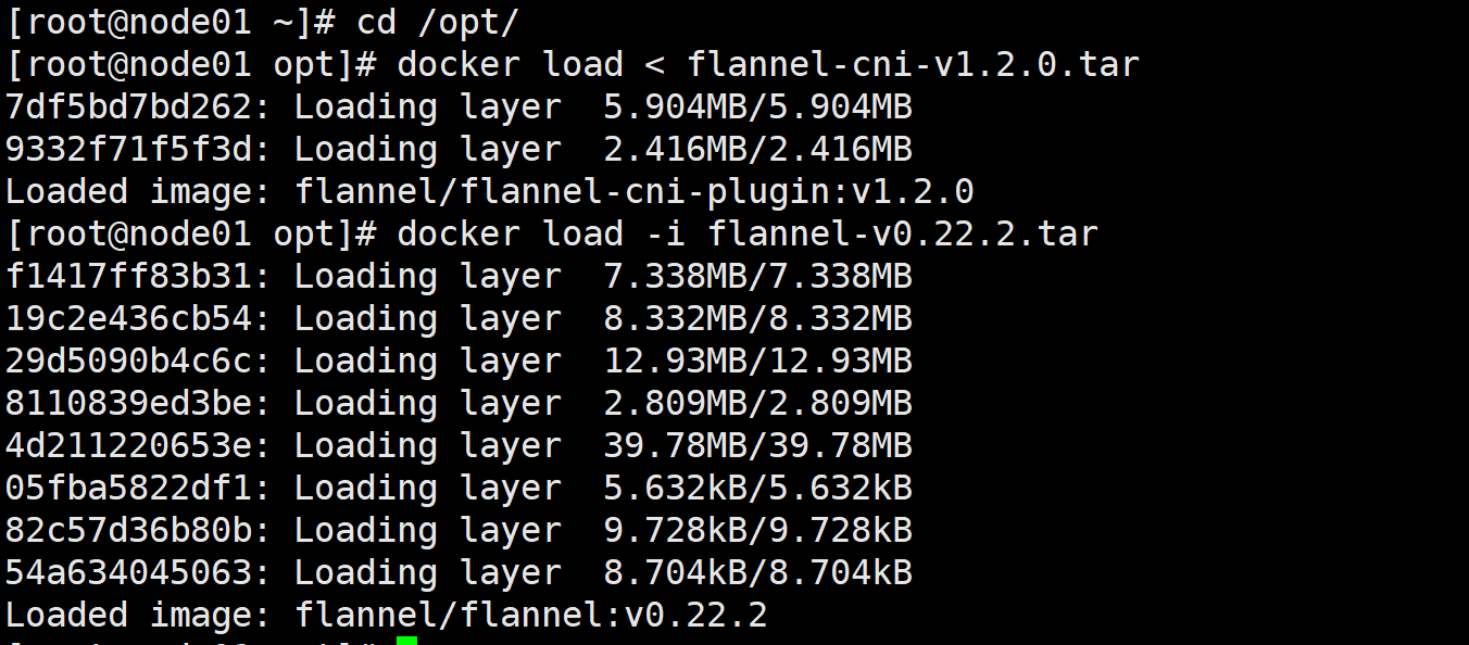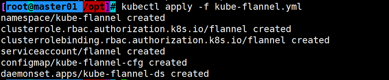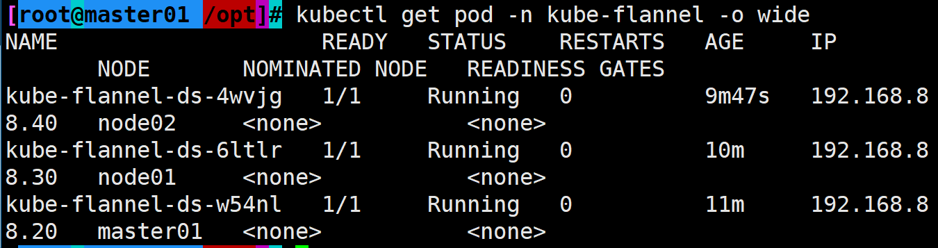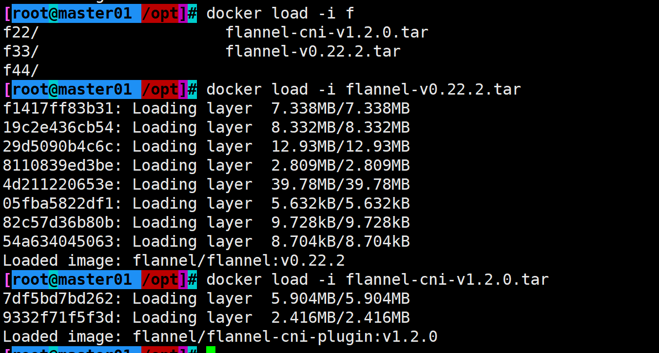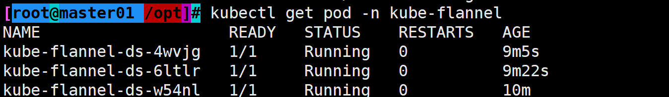 所有节点上传flannel镜像 flannel.tar 到 /opt 目录,master节点上传 kube-flannel.yml 文件