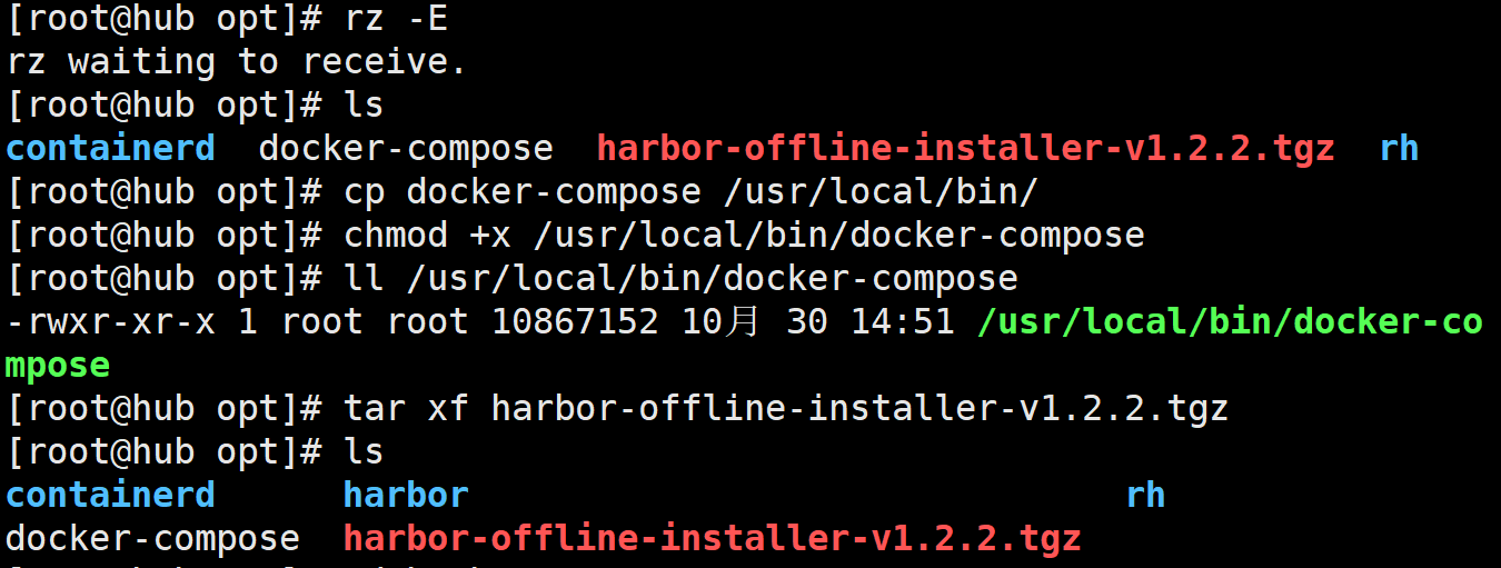 上传 harbor-offline-installer-v1.2.2.tgz 和 docker-compose 文件到 /opt