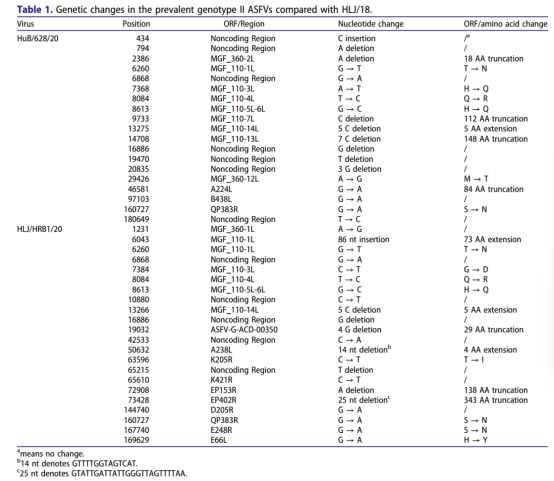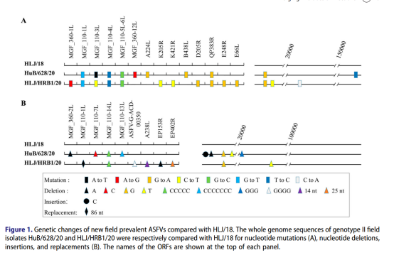 与毒株HLJ/18的全基因组相比,HuB/628/20有10个核苷酸突变,导致6个病毒基因(MGF_110-1L、MGF_110-3L、MGF_110-4L、MGF_110-5L-6L、MGF_360-12L和QP383R)的6个氨基酸发生变化,在非编码区有一个C插入,涉及4个病毒基因(MGF_360-2L、MGF_360-7L、MGF_110-14L、MGF_360-2L、MGF_360-7L、MGF_110-14L)的8个位点有20个核苷酸缺失。(图1和表1)。我们的遗传分析显示,与早期分离的HLJ/18相比,流行的强毒基因型病毒HuB/628/20基因组发生了许多遗传改变。