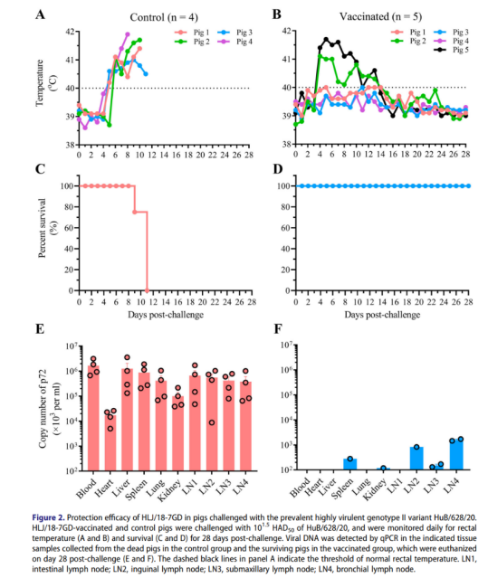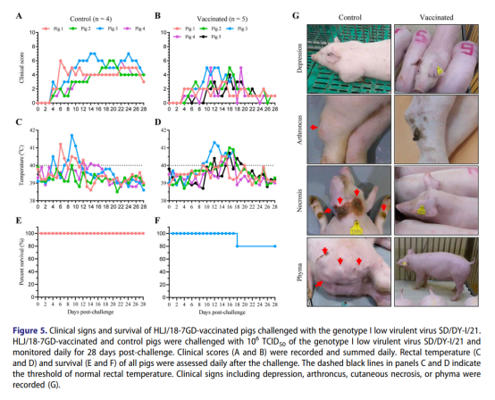 为了研究HLJ/18-7GD是否能诱导对新出现的低致死基因型ASFV变体的保护作用,本实验对5头7周龄SPF猪进行了免疫。