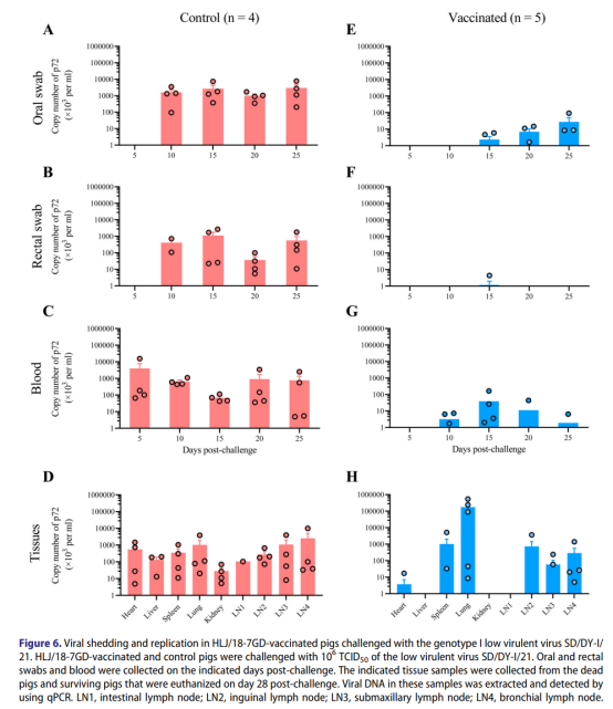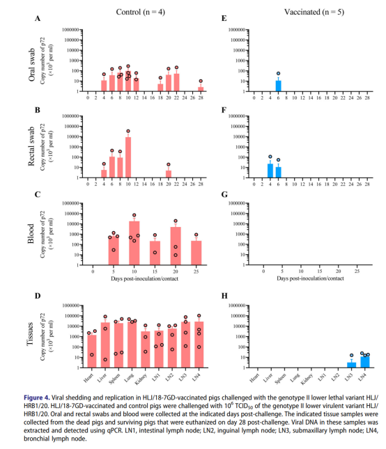 在所有4只对照猪的组织和淋巴结中检测到高水平的病毒DNA(图4),但在3只接种猪的4个淋巴结样本中检测到极低水平的病毒DNA(图4)。这些结果表明,HLJ/18-7GD诱导了猪对自然发生的低毒力变异的有效保护,减少了病毒在体内的脱落和复制,并防止了慢性抑郁症临床症状的发展。关节炎、肺肿和皮肤坏死