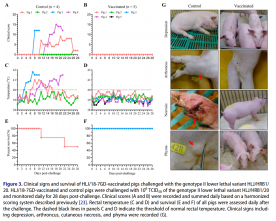 用HLJ/18-7GD 106 TCID50免疫,然后在第28天下午3点用HLJ/HRB1/ 20 106 TCID50免疫。4只对照猪免疫相同剂量的HLJ/HRB1/20病毒。每天记录直肠温度、存活率和临床症状,包括厌食、平躺、皮疹和关节肿胀,持续28天。然后使用先前描述的评分系统对每头猪的每日临床评分进行汇总,并进行轻微修改。在对照组中,一只猪从第9天开始发烧,从第8天开始出现高临床评分和抑郁,并在第11天死亡。