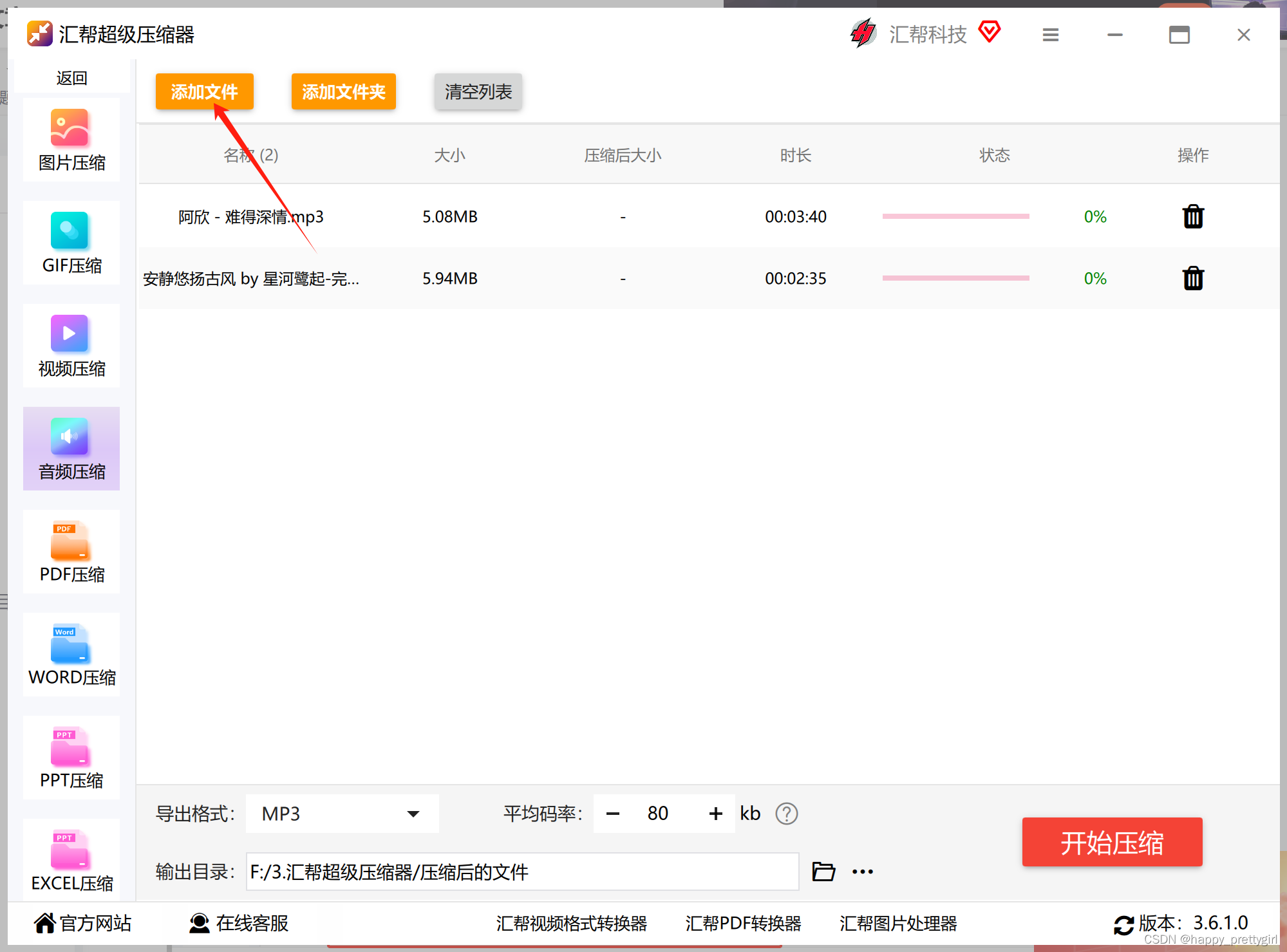 第三步:点击“添加文件”把需要压缩的音频文件添加到软件中