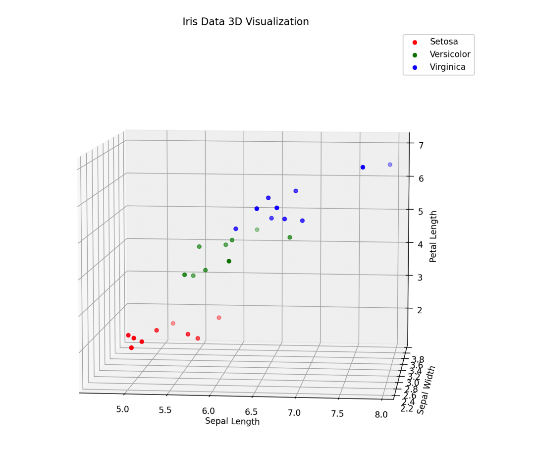 ax.scatter(X_test[y_test == i, 0], X_test[y_test == i, 1], X_test[y_test == i, 2], c=colors[i], label=labels[i])