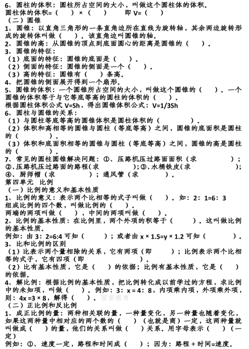 5、圆锥的体积:一个圆锥所占空间的大小,叫做这个圆锥的体积。一个圆锥的体积等于与它等底等高的圆柱的体积的1/3。