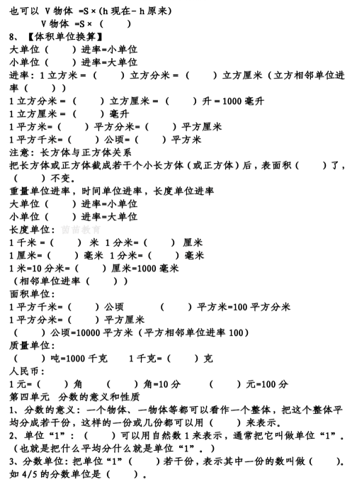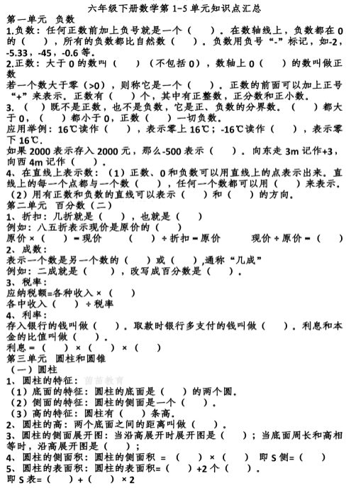 6、圆柱的体积:圆柱所占空间的大小,叫做这个圆柱体的体积。