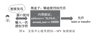 如图6所示,当资源提供者有发币意向时,需调用发币函数并提供相关信息,如货币数量和发行时间等。为了获得授权,开发商需要向交易中心提交一个包含SPV签名的请求。