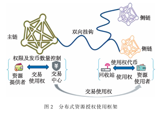 该框架分为主链和侧链,主链用于资源提供者将使用权发放出去,侧链用于资源使用者利用使用权代币行使使用权,两条链用双向挂钩机制进行联系(如图2所示)。主链功能比较复杂,主要负责资源提供者和交易中心之间的大额资源流通,用于整体处理多笔交易,其中需要包括交易数量的限制、监督记录等功能。侧链则可以视为是部署在不同地区、应用于不同币种的负责多次小额交易的流通处,它有很多条并行且互不干扰的链,其功能较为单一简洁,主要负责资源使用者和回收站之间的使用权交易。因此一条主链应该对应一条或者多条侧链。