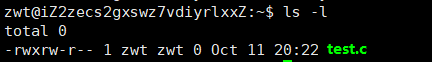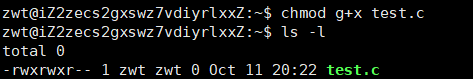 在这个test.c文件中,所属组的权限为rw-,没有执行权限,且文件的拥有者为zwt,所以我们就可以用zwt身份或root身份下进行操作,赋予所属组执行权限