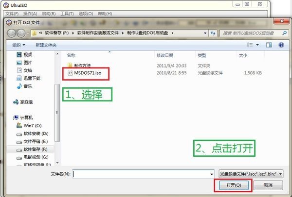 2、点一下“开启”按键,在弹出来的提示框内挑选映像文件MSDOS7.10.ISO,点“开启”载入文件。