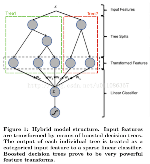 动机在于 GBDT 无法直接处理海量的离散特征,复杂度太高,所以主要思路就是先用已有特征训练 GBDT 模型,然后利用 GBDT 模型学习到的树来构造新特征,最后把这些新特征加入原有特征一起训练模型。构造的新特征向量是取值 0/1 的,向量的每个元素对应于 GBDT 模型中树的叶子结点。当一个样本点通过某棵树最终落在这棵树的一个叶子结点上,那么在新特征向量中这个叶子结点对应的元素值为 1,而这棵树的其他叶子结点对应的元素值为 0。新特征向量的长度等于 GBDT 模型里所有树包含的叶子结点数之和。最后的输出一般会接一个 Logistic Regression,事实上就是一种 Stacking 的模型融合方式。如下图所示: