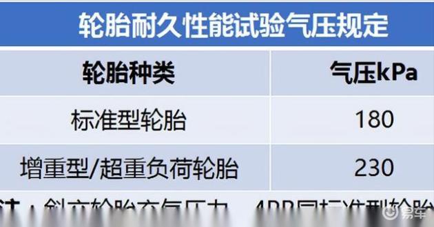 轮胎安装在符合规定的标准轮辋上,充以下表中规定的气压,将轮胎轮辋组合体在38℃士3℃的温度下至少停放3h。轮胎按GB/T4502(ISO10191:1993)规定的试验条件和试验方法进行耐久性试验后,轮胎气压不应低于规定的初始气压,轮胎外观检查不应有(胎面、胎侧、帘布层等)脱层、帘布层裂缝、帘线剥离、泵花、接头裂开、龟裂等缺陷。具体试验类似上述高速性能测试。
