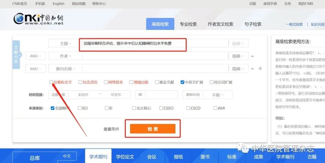 中文期刊全文数据库有哪些类型(中文期刊全文数据库cnki)近期 中国知网的检索设置有所调整 对于非全文收录的期刊文章 只能通过学术期刊库的高级检索界面进行展示 为便于中华医学会系列杂志文章作者的检索需求 我们特将调整后的检索策略做如下说明 1 点击 www cnki net 进入知网首页后 点击学术期刊 进入学术期刊库 2 在学术期刊库中 点击高级检索 3 在高级检索中 将箭头所指处的 仅看有全文 的 号勾除后
