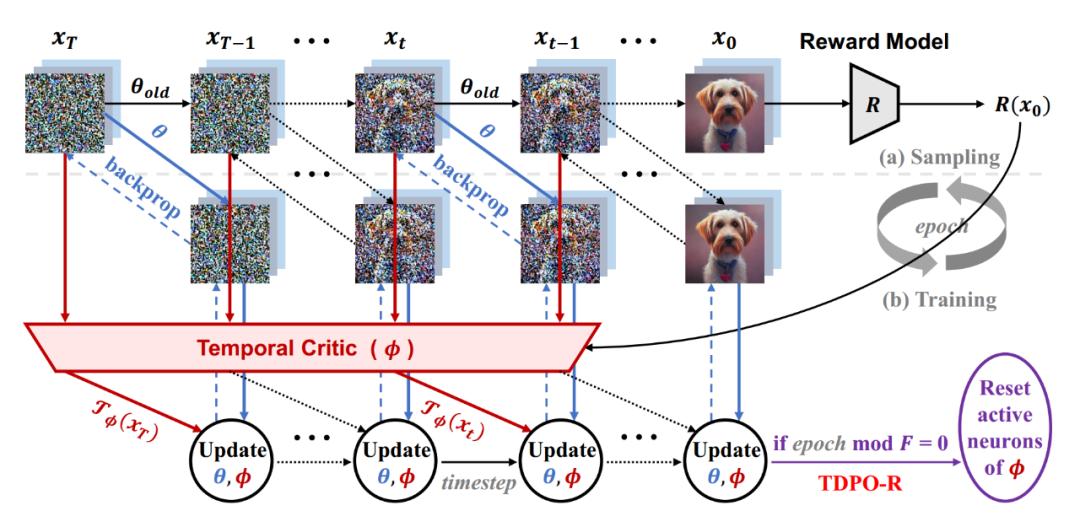 周期性神经元重置:在训练过程中,TDPO-R 会定期对评判器(critic)模型中过度活跃的神经元进行重置,降低它们的激活频率,从而打破它们在早期阶段对特定奖励信号的过拟合。通过这一操作,模型可以避免过度强化某一奖励目标,确保生成过程的多样性和泛化能力。