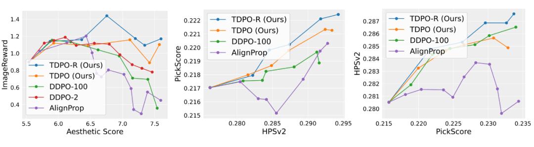 研究者使用提出的 TDPO-R 对 Stable Diffusion v1.4 模型进行微调训练,并采取不同文本提示词集和奖励函数进行评估实验。为了更直观地展现跨奖励泛化度量的效果,研究者通过图表展示了在优化某一特定目标奖励函数(如 Aesthetic Score)时,模型在其他多种奖励函数(如 ImageReward、HPSv2 和 PickScore)上的得分如何变化。如上图所示,其中每幅图表的横坐标代表训练保存的中间模型在目标奖励函数上的得分,而纵坐标代表对应的中间模型在域外奖励函数上的得分。通过这些图表,可以清楚地观察到 TDPO-R 和其他扩散模型对齐方法(如 DDPO 和 AlignProp)在跨奖励泛化能力上的差异。