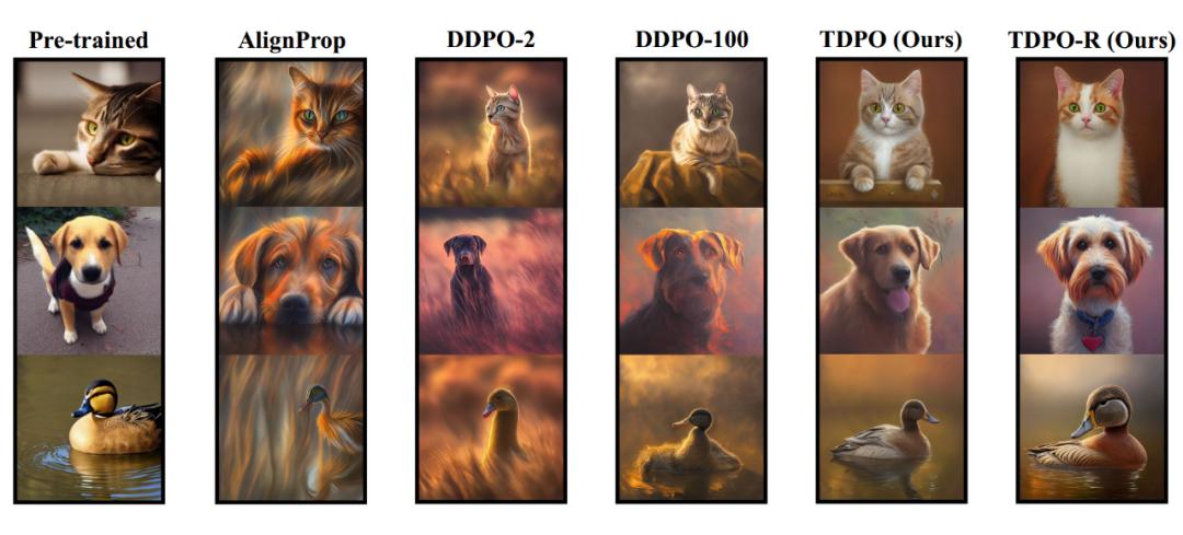 除了定量指标的对比,研究者还通过可视化图像样本的对比展示了 TDPO-R 相较于其他方法的优势。如下图所示对比了 TDPO-R 与其他方法,皆将目标奖励函数(Aesthetic Score)的得分提升至同一临界值时所生成的样本图像。可以看出,在其它方法中,不同文本提示词对应的图像样本风格趋同,尤其是在光线、色调和构图风格方面,缺乏多样性,甚至还存在图像失真的情况。相比之下,TDPO-R 不仅能够生成更具视觉自然感和细节保真的图像,还保留了风格的多样性,具有更平衡的美学表现,直观地体现了 TDPO-R 缓解奖励过优化的有效性。
