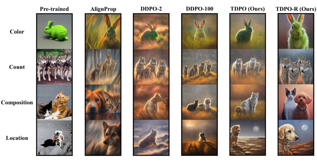 如下图所示,在生成包含复杂场景描述的图像时,其它方法存在图像细节不准确的问题,忽略了关键的语义元素(如物体的数量、类型以及场景地点等),表现出典型的文图语义不一致问题。而 TDPO-R 生成的图像不仅视觉丰富,还能够准确反映文本描述的内容。这体现了 TDPO-R 的跨任务泛化能力,即在提升图像美学表现的同时,还能够有效保留文图的语义一致性。