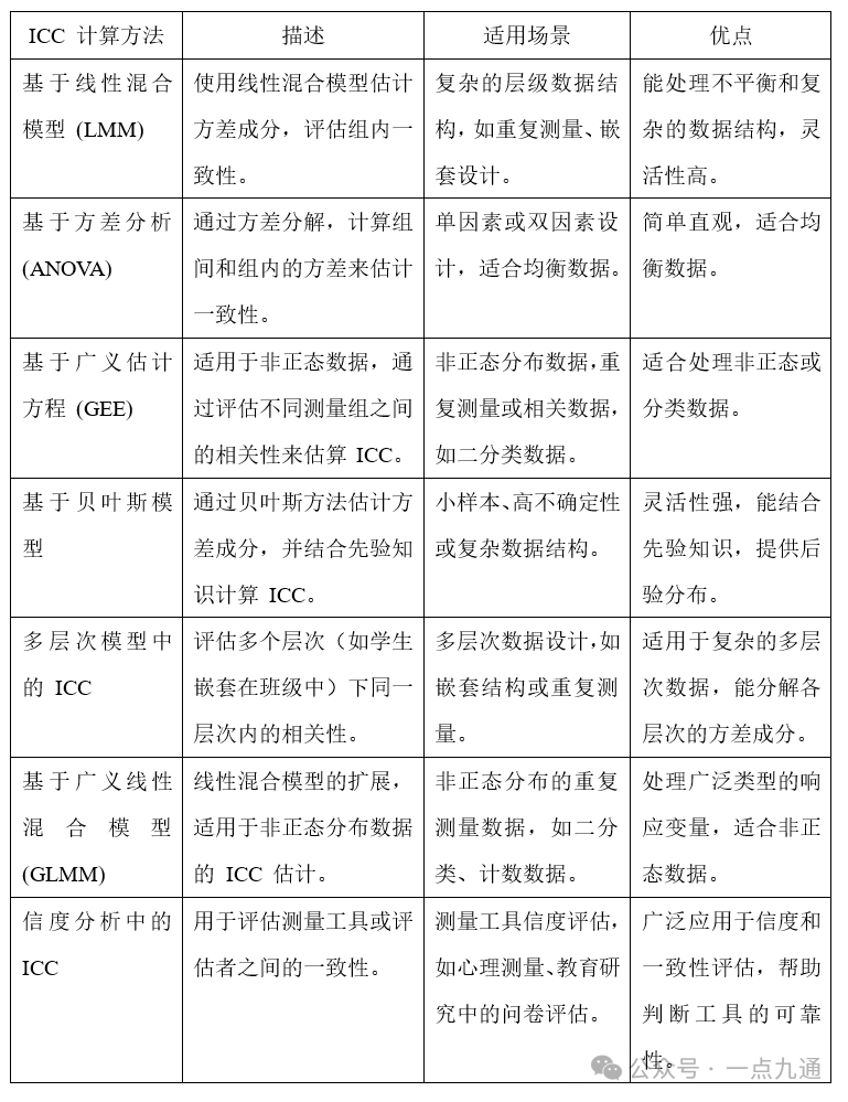 优点:方差分析的 ICC 计算简单直观,适合于均衡数据。