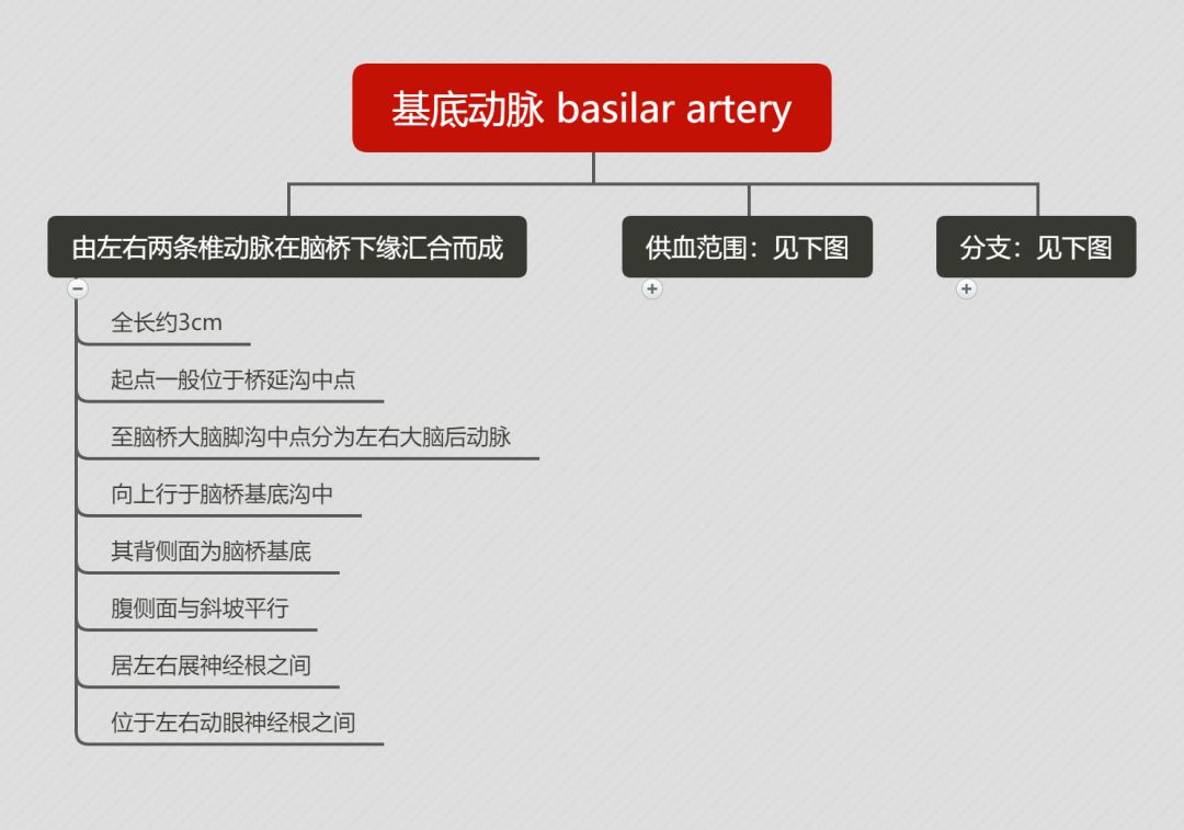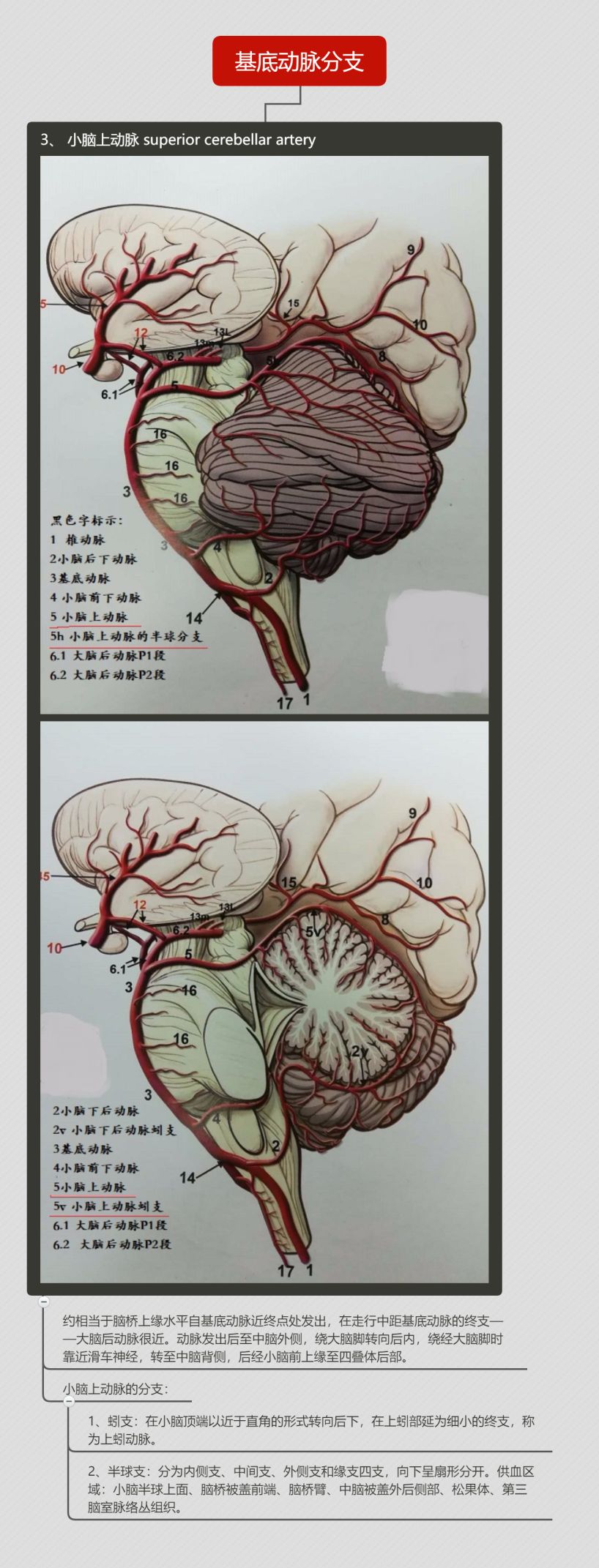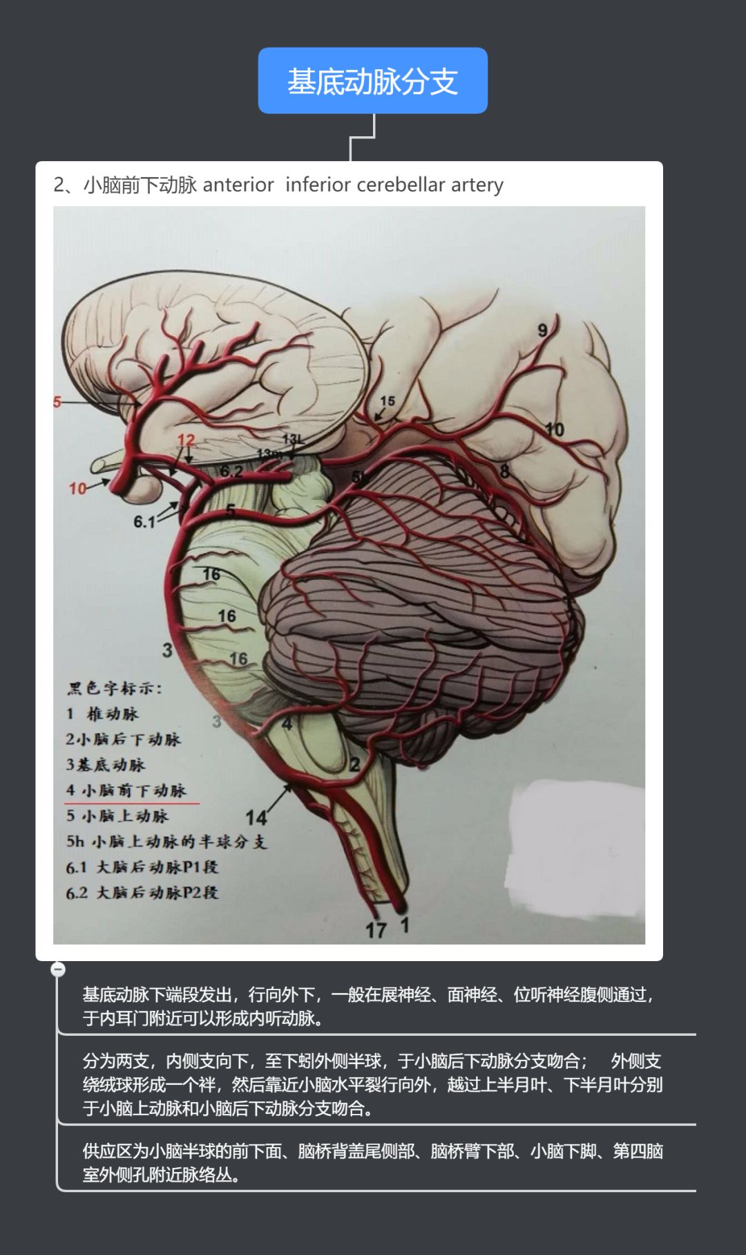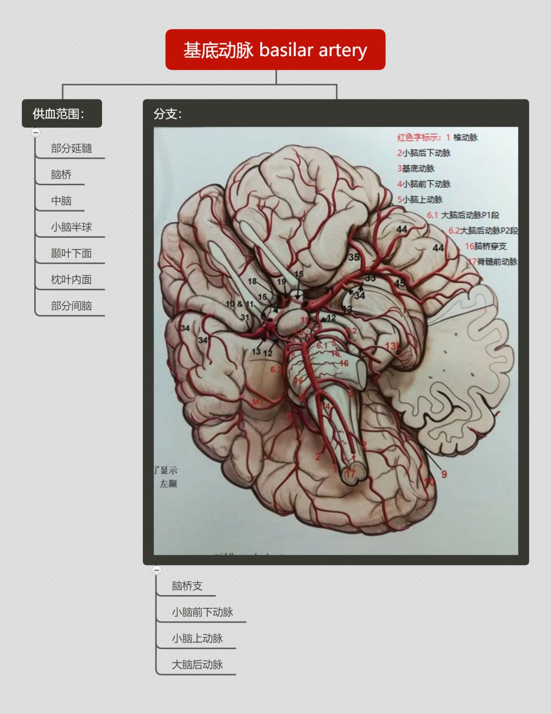 分层图(头的解剖结构分层图)简洁而实用 1 椎 基底动脉系统的构成 2 椎动脉的特点 供血区域 分段 颅内三处狭窄 3 椎动脉的相关临床知识点 4 椎动脉的分支 5 小脑后下动脉的分段 分支及相关临床知识点 6 基底动脉的供血范围 分支 7 基底动脉脑桥支的分支 及相关临床知识点 8 基底动脉的分支 9 大脑后动脉分段 10 大脑后动脉分支 中央支 脑室及脉络丛支 皮质支 11 后颅窝动脉及椎动脉 附图 备注