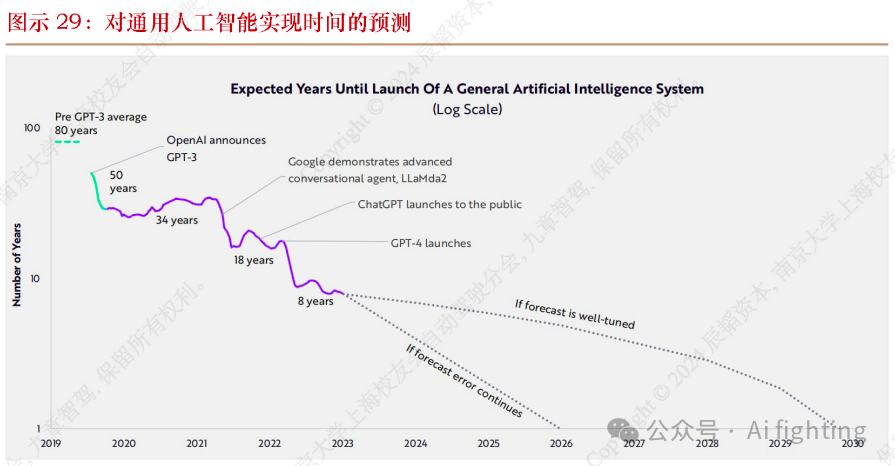 随着大模型在2022年以来的快速发展,人们对通用人工智能的到来时间有了更乐观的预期。方舟资本发布的《Big Ideas for 2024》报告中指出,目前,通用人工智能预期实现的时间已经提前到2027-2031年。在这一语境下,AGI主要指的是语言大模型、多模态大模型等虚拟世界中的AGI。