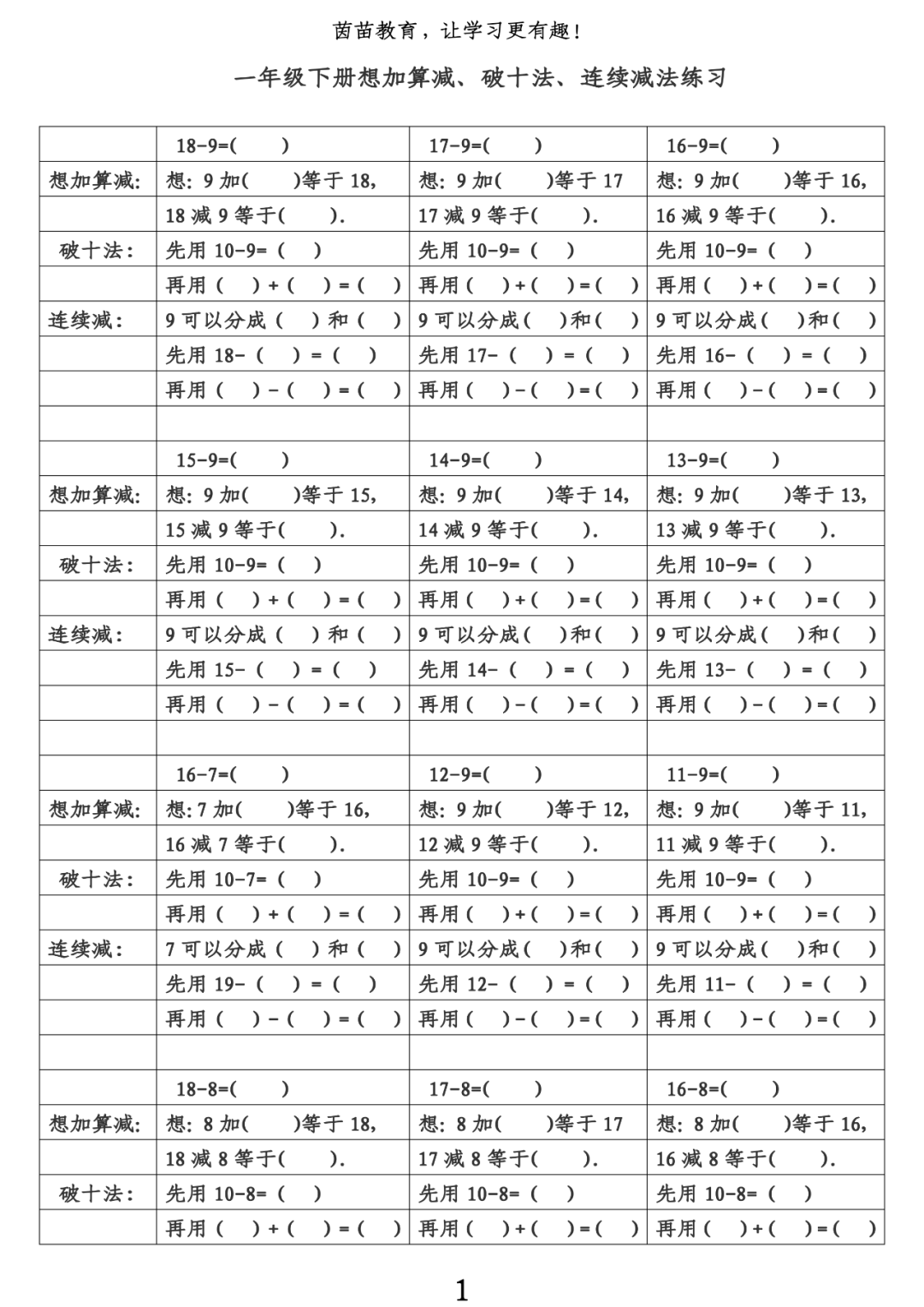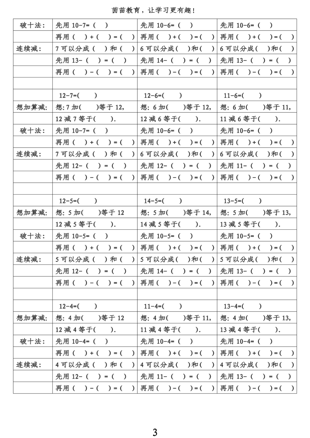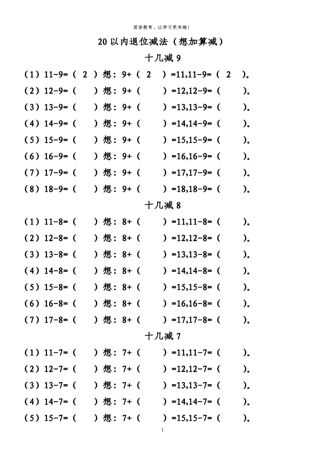 计算20以内的退位减法有三种方法:想加算减、破十法、连续减法(平十法)